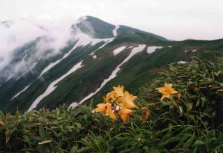 朝は3時半頃からゴソゴソと身支度の音で目がさめる。朝食は味噌汁と生卵と海苔の佃煮だ。小雨で視界が悪く身支度に時間がかかり、出発は7時になってしまった。残雪が道のあちらこちらに現れるが、登りは緩やか。本山小屋と神社だけの飯豊神社が視界が悪いところから急に目の前に現れる。靴もぬれ始めたので先を急ぐことにする。飯豊本山山頂で記念写真を撮り、駒形山を過ぎるとニッコウキスゲの群落になり、少し下って御西岳を過ぎるとまもなく御西小屋に到着する。