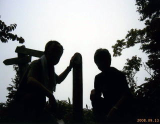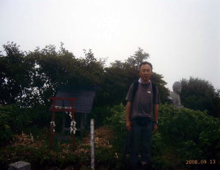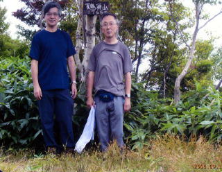 持ってきたタオルはこの時点でみんな汗でびしょぬれだ。山頂は狭く2人程度しか休憩するスペースはない。山の標識も1枚小さいのがあるだけだ。少し早いが12時前になったので、昼食にする。汗をかいたので、飲み物がうまい。雲は厚く、展望はないどころか、今にも雨が降り出しそうな空模様だ。