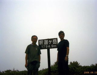 釈迦ヶ岳への登りは幅こそ広いが、足の踏み場が傾斜で、笹に覆われており、滑るようで登りにくい。途中から雨が降り出し、傘をさして山頂を目指した。予定時間より10分ほど余分にかかって。1時10分に山頂に着く。
