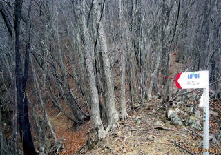 道標はトラバースの道をさしているが、まっすぐ直登の道にも木に赤いテープが巻かれている。パソコンで見た人は直登したので、トラバースの道を行くことにする。パソコンの登山記録にある通り、がれている。ただ、50mくらいまでで、あとはそんな危ないところはなかった。鋸尾根の登山道まで20分かかり、出た時はほっとした。