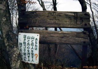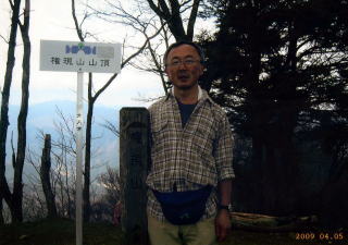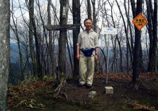 やや若い人が食事をしていた。どこ行くのか尋ねたら、北峰から坪山経由で西原に出るという。北峰から坪山までが地図には道の線がないが、稜線の道はあるという。写真を撮ってもらい、権現山へ向かう。途中、分岐点かららしい急坂の道との合流点を見つけるが、標識もテープも見当たらなかった。道はどんどん広くなり、いったん下って権現への登りを進むが、大した登りはなく、山頂に着く。