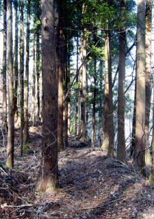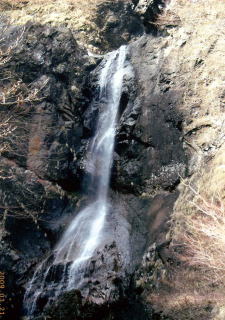下って少し登ったところにけば、岩の形がよく撮影できたが、余裕もなく、誰もいないので、早く下ることにする。下に横川駅の標識が見えたので下る。沢沿いの道なので、岩が滑りやすいので、鎖場が5本ほど連続していた。しばらくは下りの急な道になったが、また鎖場が出てきた。標識と木に黄色いペンキや赤い布があるので、迷うことはないが、落ち葉に埋もれて、道がよく見えず、ふみ跡もあまりない。もしかして、春最初の登山者だったりして!ところどころ道だと思ったら、落ち葉が積もり、足がずぼっと入ってしまた事も数回あった。1回は落葉の下に流れがあるのがわからず、足を滑らせ、ズボンを濡らしてしまった。道が右岸から、左岸になるところで、水筒に水を入れ、休憩する。左岸になると、とたんに杉林が現れ、道がはっきりする。