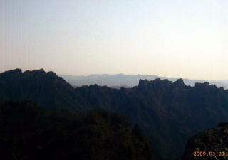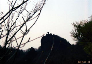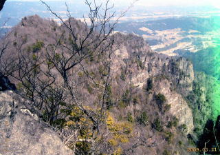 このペースだと963mの御岳で昼食になるようだ。ここからは少し登りも緩やかになるが、産泰山らしき峰を過ぎたら、左右の絶壁が迫り、慎重に歩かざるを得なくなる。道もくねくねと曲がるところが多く、岩が迫る。洞窟を過ぎると、鎖場が2本続き、石碑のある頂に出ると、どうやら目の前に見える頂が御岳らしい。御岳に着くと、丁須ノ頭が目の前に見えた。