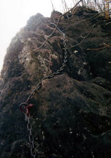 目的地の近くに来て、鎖のある岩場で目の上の位置にある道がわからず、10分ほど鎖を降りたりして時間のロスをする。ようやく道がわかり、12:40にたどり着いた。 ところが驚いたことに、丁須ノ頭に登る鎖場は垂直で、腕で登るしかなく、体が左右に振れる恐れもあり、、腕も疲れてので、やめることにする。