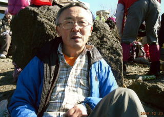 丁度ほぼ同時に着いたグループの人に、雲が出かかった富士をバックに写真を撮ってもらい、服を着ようとしたら、指が動かない!ボタンを閉められず困る。強い寒風の中、手を温めたりして、ようやく7〜8分かかって、シャツやセーター・防寒着を着て、ボタンやチャックを閉めることができた。