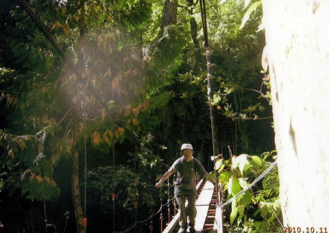 下着まで汗でぬれていて気持ち悪い。時々崖をえぐった道が現れる。また、道を迂回するため、丸太の階段があり、約15mほど登って今度は5mほど水平の丸太の道を歩き、また丸太の階段で降りるようになっている。今朝までの雨で滴が垂れ、滑りやすくなっているので、用心しながら登り下りする。丸太の垂直に近い階段ヤ道ををよく作ったものだと感心する。残雪も現れる。