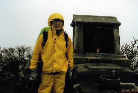 全員が登頂してきたので外に出て写真を撮り、神社にお参りした後、また小屋に逃げ込む。