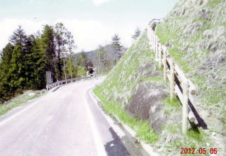 途中からまた分岐して山の中への道となるが、沢で工事中の林道と合流すると、あとは舗装された道を下る。工事のための宿舎や車両置き場があちこちに点在している。