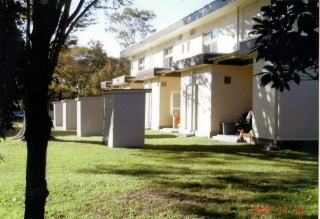 やがてCセブンイレブン伊奈平5丁目店を左折し、脇道に入っていく。住宅街の中を抜けると、左手に基地沿いの道となる。基地内には2階建てで4〜5頭棟続きのテラスハウス式住宅が並んでいる。