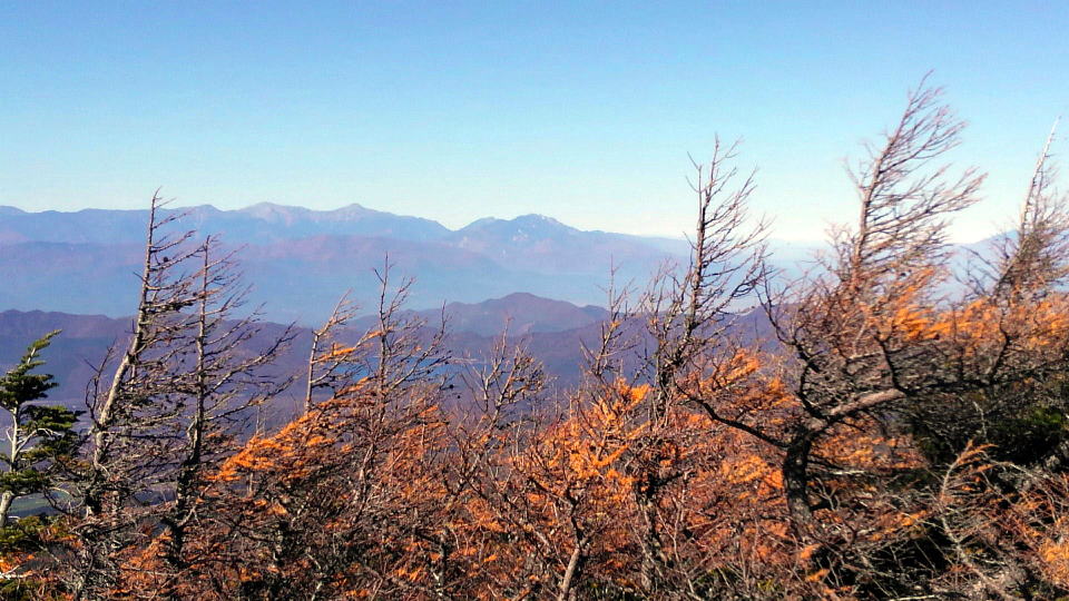 奥庭には展望台があるらしいので、まずそこに行く。西方向に展望が開けていて、雲一つないので、南アルプスが、甲斐駒からずっと南の方まで見える。