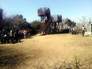 北峰山頂には大きな展望台があり、展望は360度素晴らしい。東京湾の展望のほか、近くに鋸山や遠くにアクアラインの塔らしきものも見える。富士山は雲がかかり、わずかしか見えない。