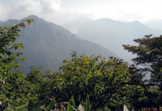 日差しはなくなる代わりに風がなく蒸し暑い。30分ほど登った所で、丁度昼飯ができる場所があったのでお昼にする。ロープウエイがすぐそばを通っている。荷物が少しでも軽くなることがうれしかった。昼食後また登り始めるが道はジグザグが多く、勾配はそんなにきつくない。